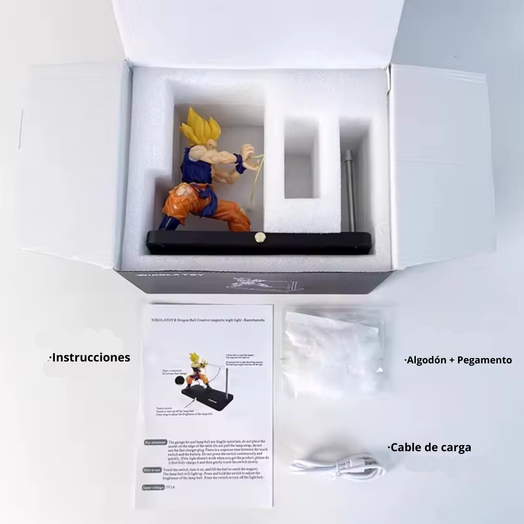 Dale poder a tu espacio con esta increíble lámpara de Goku en modo Super Saiyan. El efecto de energía flotante con luz LED crea una escena épica del Kamehameha. Ideal para cuartos otaku, escritorios o como regalo único para fans de Dragon Ball.